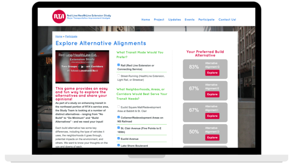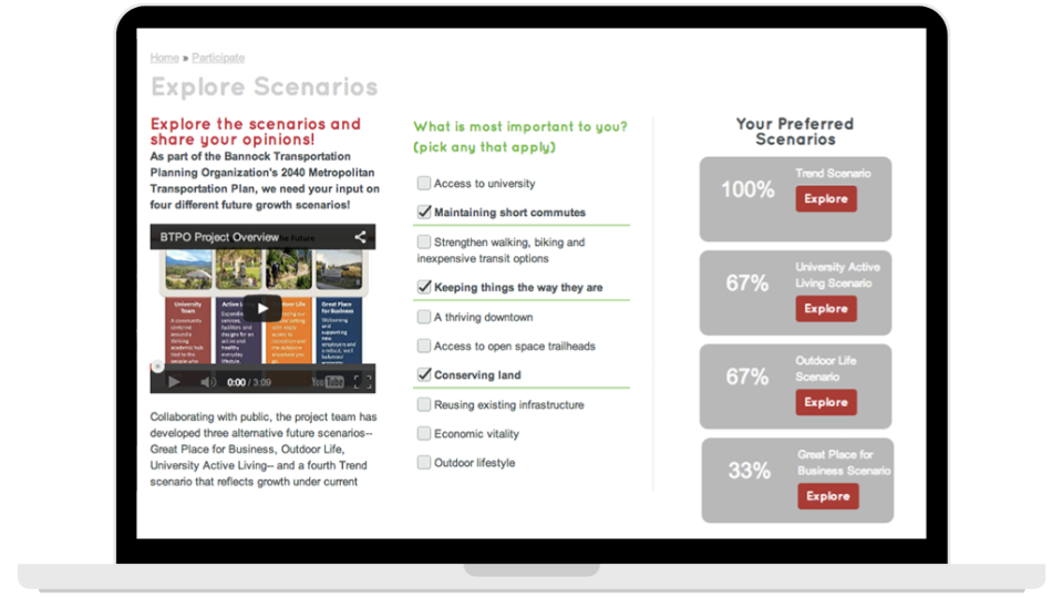 Basic - Single Metric or Budget graph Budget Simulator Add chart here... Spending Public Safety Police Police $0m $120m Fire Fire $0m $80m Infrastructure Transportation Transportation $0m $120m Water Water $0m $80m Solid Waste Services Solid Waste Services $0m $50 Climate Action & Sustainability Climate Action & Sustainability $0m $40m Community Resources Education Education $0m $160m Parks & Rec Parks & Rec $0 $100m Neighborhood Development Neighborhood Development $0m $60m Revenue Local sales tax 1%, generates $10m in additional revenue 1.5%, generates $15m in additional revenue 2%, generates $30m in additional revenue none Bond 1a - if approved will generates $10m in additional revenue 2b - if approved will generates $15m in additional revenue 3c - if approved will generates $30m in additional revenue none Feedback Your feedback Leave this field blank Submit Advanced - Multiple Metrics Housing & Parking Policy Tradeoff Explorer Chart here Your Neighborhood What's the name of your neighborhood? Your Choices Housing Mix Mostly SFH Balanced Mix Mostly MFH Parking Minimums High (2+/unit) Medium (1/unit) Low (0–0.5/unit) FAR Limit FAR Limit 0.5 2.5 Allow ADUs No Yes Your Feedback Tell us why you prefer those changes for your neighborhood? Leave this field blank Submit Advanced - Custom Model Housing Feasibility Simulator Insert Prototypes here Inputs Select County Beaver County Cache County Rental Rate Low Average High Land Value Low Average High Feasibility IRR Cut Off Feasibility IRR Cut Off 0% 20% Your Feedback Which housing types should be prioritized? Duplex Triplex Fourplex Fiveplex Courtyard Multiplex Explain why? Leave this field blank Submit Other Examples
